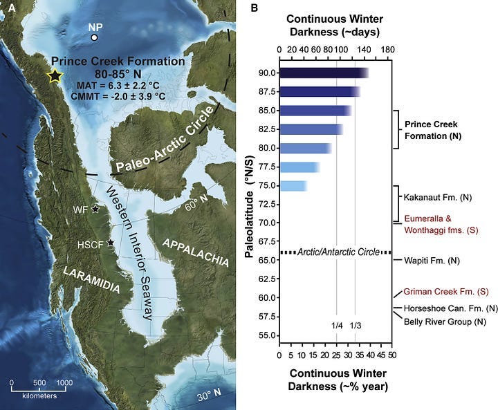 During the Late Cretaceous, parts of what is now northern Alaska sat at extremely high latitudes, well within the zone of prolonged winter darkness. These environments were not frozen year-round, but they were strongly seasonal. Summers were short. Winters were dark and cold. Plant growth was limited to part of the year, and food availability fluctuated sharply.